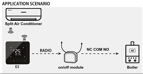 Scene application 1: Heating with Radio and cooling with IR control, under this application, E3 is able to directly associate with a Radio on/off module to control a heating equipment like wall-mounted boiler as well as controlling an IR split air conditioner for cooling. (Note: it is able to connect with at most 8 pieces of Radio on/off modules, the heating equipment can be replaced by a cooling equipment or a fan or other on/off equip ments)
